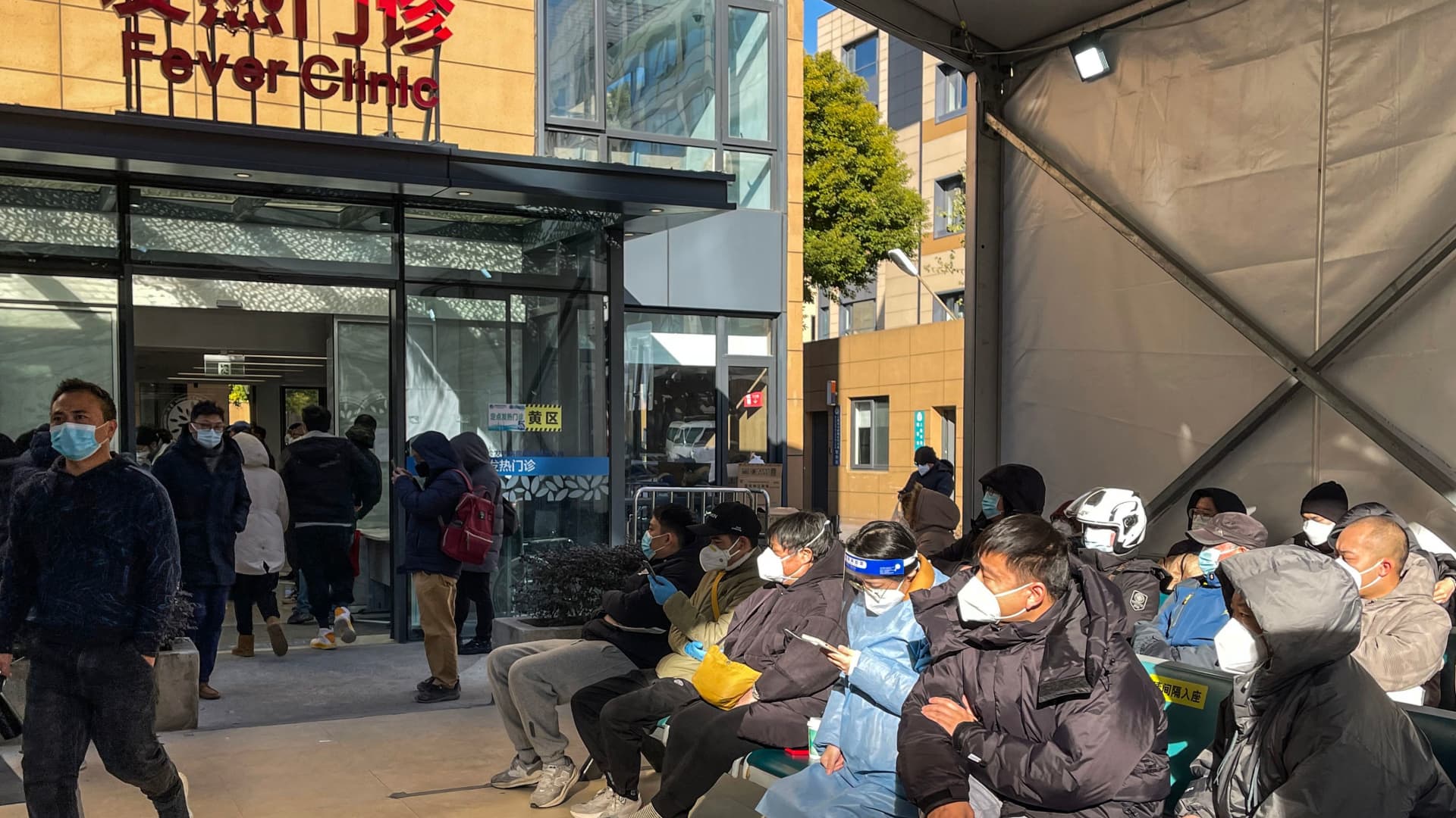 People wait outside a fever clinic at Tongren Hospital in Shanghai, December 23, 2022 amid a local outbreak of Covid-19 infections.